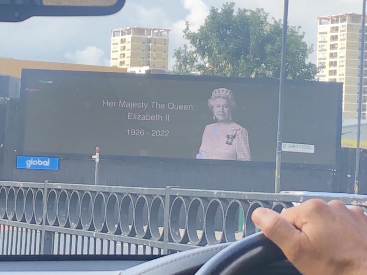 中心地の土産物屋には喪もセレモニーも関係なく、女王のハリボテが置かれて客引きに使われているので、そこそこ慣れた感覚ではあるものの、住宅街のサイネージで彼女の顔を見るのは初めてで、やはり特別な事態なのだなあという感じがあった。